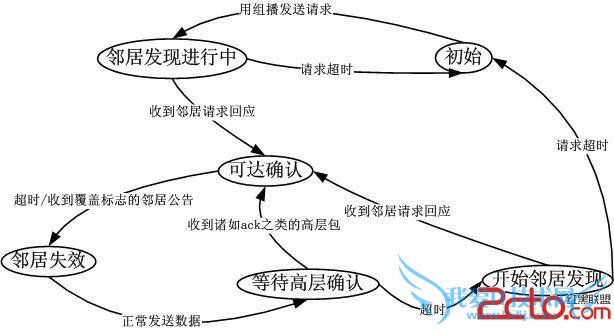 IPv6以太网的地址解析使用组播进行,不再使用广播。这个过程十分简单,如果知道节点的IPv6地址,其组播地址可以自动算出来,然后就往这个组播地址发送解析报文请求即可,其实就是个邻居发现,得到回应后将MAC-IP对缓存起来,这个MAC-IP对的缓存有一个状态图,这个状态图猛一看好像是Linux的ARP缓存状态图,它们太像了,简直就是一个: