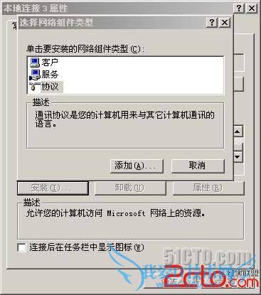 在Windows 2000中,如果未安装有TCP/IP通信协议,可选择“开始/设置/控制面板/网络和拨号连接”,右键单击“本地连接”选择“属性”将出现“本地连接属性”对话框,单击对话框中的“安装”按钮,选取其中的TCP/IP协议,(如图1)然后单击“添加”按钮。系统会询问你是否要进行“DHCP服务器”的设置?如果你局域网内的IP地址是固定的(一般是这样),可选择“否”。随后,系统开始从安装盘中复制所需的文件。