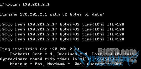 当TCP/IP协议安装并设置结束后,为了保证其能够正常工作,在使用前一定要进行测试。我建议大家使用系统自带的工具程序:PING命令,该工具可以检查任何一个用户是否与同一网段的其他用户连通,是否与其他网段的用户连接正常,同时还能检查出自己的IP地址是否与其他用户的IP地址发生冲突。假如服务器的IP地址为190.201.2.1,如要测试你的机器是否与服务器接通时,只需切换到DOS提示符下,并键入命令“PING190.201.2.1”即可。如果出现类似于“Reply from 190.201.2.1……”的回应,(如图3)说明TCP/IP协议工作正常;如果显示类似于“Request timed out”的信息,说明双方的TCP/IP协议的设置可能有错,或网络的其它连接(如网卡、HUB或连线等)有问题,还需进一步检查。