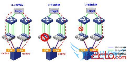 节点故障(图4.b):当某台FCoE接入交换机发生故障,或某个存储网络内部发生故障,服务器相应一端的CNA卡将停止FC报文发送,服务器另一个CNA网卡不受连接的SAN网络不受此故障影响,仍可以正常工作。