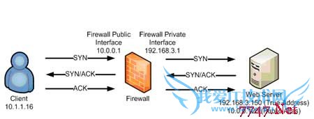 代理防火墙的存在使排除客户机与服务器之间的连接故障更复杂了。为了诊断一个故障,需要对防火墙的两边都进行监视。我们需要一个查看防火墙外部通讯的外部监视设备,还需要一个查看防火墙的每个内部接口的内部监视设备。让我们看几个普通的连接问题以及它们在tcpdump输出中是如何出现的。我们的所有例子都将使用上面解释的连接情况。需要指出的是web服务器有两个IP地址:192.168.3.150是服务器在有防火墙的局域网内部的服务器专用地址。10.0.0.120是暴露给世界的公共地址。