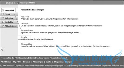 申请完毕后登录该邮箱,我们看到邮箱容量为25MB,不过这时候是德语界面,我们需要设置成中文界面以方便以后的使用。点击“Optionen”链接进入Hotmail的设置界面,如图2所示,接下来点击左边的“Personlich”(个人设置)链接,在打开的页面中点击“Sprache”(语言设置),进入后勾选“简体中文即可”。
