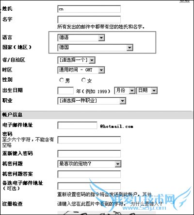 首先打开http://www.hotmail.com页面,点击登录框下面的“立即注册”按钮,在打开的.passport注册页面的“国家(地区)”和“语言”一项中分别选择“德国”和“德语”,这时候再填写申请表格就可以获得[email?protected]的邮箱地址了,如图1所示。可能很多朋友对德语不熟悉,笔者提示一下几个比较关键的地方:“Kennwort”栏输入密码、“Geheime Antwort”栏输入密码提示答案、“Nachname”输入你的姓氏。