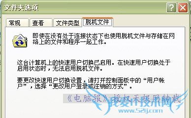 打开资源管理器,点击“工具→文件夹选项→脱机文件”,刚才那个MM的这个位置显示了图3所示的文字。意思是该用户的快速切换已启用,无法使用脱机文件。那么,立马打开“控制面板→用户帐户”,在“挑选一项任务中”选择“更改用户登录或注销的方式”。将“使用快速用户切换”前的钩去掉后应用。最后回到“文件夹选项”的“脱机文件”下,勾选“启用脱机文件”即可。不过,现在即使启用了“脱机文件”也无法看到刚才网页。只有重新连接上网后才可以再次进行脱机工作。
