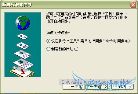 继续点击“下一步”,看到图2界面,这里选择默认选项“仅在执行‘工具’菜单的‘同步命令时同步’”。再点击“下一步”,完成脱机设置。