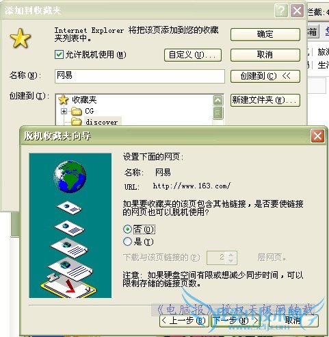 首先,在联网状态下将需要离线收看的站点添加到收藏夹中。在添加到收藏夹中时,一定要勾选“允许脱机使用”。然后点击“自定义按钮”,IE会弹出一个脱机收藏夹向导,点击“下一步”,就可以对这个站点的网页进行脱机设置了。在这页设置中勾选“是”(如图1),那么,脱机设置就可以为你下载该站点下的几层链接。