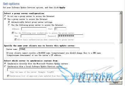 在“Select a proxy server configuration”中对SUS Server的代理服务器参数进行设置,如果SUS Server是直接或通过路由器接入互联网,一定要选择“Automatically detect proxy server settings”项,如果是通过代理服务器的话,要选择“Use the following proxy server to access the Internet”项,并在输入框中填上代理的IP地址和端口号