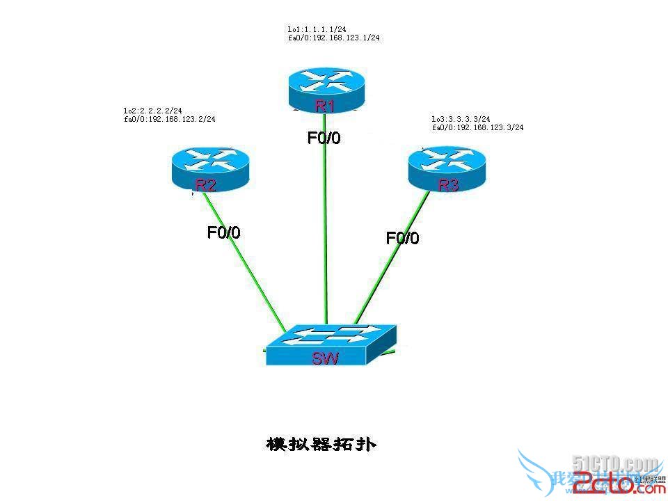 2,以R1为中心,让R2和R3与R1分别建立邻居关系,而R2和R3之间路由不可达。