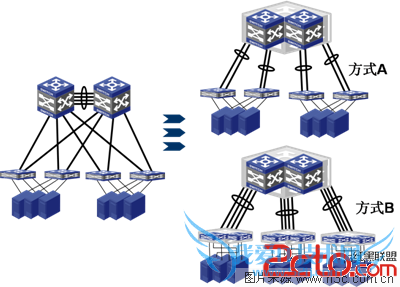 l 方式A,保持原有网络拓扑和设备独立性不变,将汇聚层做虚拟化,接入交换机双归属上联的两条链路直接进行捆绑,消除了环路,服务器网卡归属到独立的两台交换机。