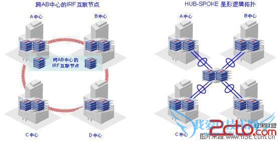 数据中心间基于光传输网络和交换机虚拟化技术的Hub-Spoke星形拓扑方案,配置管理简单、扩展性强,如果需要互联的数据中心在城域网范围内,且采用光纤资源充足,则建议采用这种方案。该方案的链路利用率高(报文在多条互联链路间做分担),故障收敛快(小于1秒),既可以做点对点互联,也可做点到多点互联。