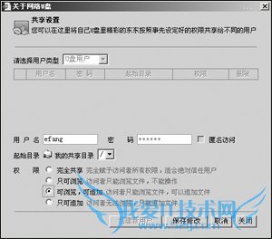 首先单击“我的U盘邻居”,这里可以看到使用U盘的其他所有用户列表,如果你要共享文件给某好友,那么单击“共享设置”按钮,在打开的页面中单击“创建新用户”,在“用户名”中输入该用户的U盘用户名并为其设置权限(分别有“完全共享、只可浏览、可浏览、可追加、只可追加”四个等级的权限),如图2所示,确认后选中该用户为其设置一个访问密码即可。当我们为某好友设置共享后,系统会给该好友发送一条提示消息。