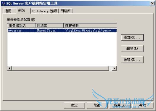 单击"别名"选项卡,还可以为服务器配置别名。服务器的别名是用来连接的名称,连接参数中的服务器是真正的服务器名称,两者可以相同或不同。如下图中,我们可以使用myserver来代替真正的服务器名称sql2kcn-02,并且使用网络库 Named Pipes。别名的设置与使用HOSTS文件有相似之处。