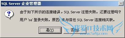 当用户尝试在查询分析器里面使用sa来连接SQL Server,或者在企业管理器里面使用sa来新建一个SQL Server注册时,经常会遇到如图 2 所示的错误信息。该错误产生的原因是由于SQL Server使用了"仅 Windows"的身份验证方式,因此用户无法使用SQL Server的登录帐户(如 sa )进行连接。解决方法如下所示: