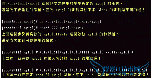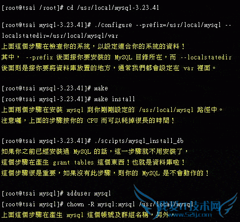 如果你英文够好的话,你可以到 /usr/local/mysql-3.23.41 这个目录中察看一下 INSTALL-SOURCE 这个档案,里面对于如何安装适合你的 MySQL 有很详尽的说明。如果你要照我的步骤作的话,请往下看吧!