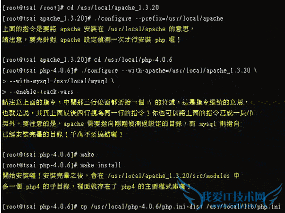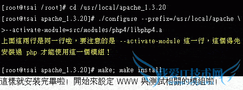 再来就是重头戏啦,开始安装 apache 啰!由于已经安装了 php ,所以在 /usr/local/apache_1.3.20/src/modules 中就会存在 php4 的目录!
