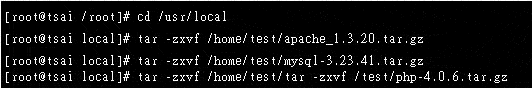假如你将 Apache, MySQL 及 PHP 三个档案放置在 /home/test 这个目录中,而要将资料解压缩到 /usr/local 当中,则可以这样下指令: