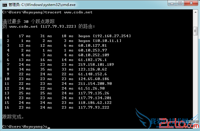 下面看一下我用tracert命令测试的本地主机到www.csdn.net之间的路径信息: