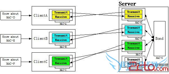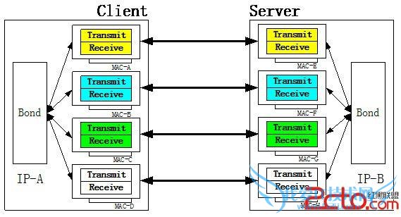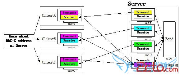 在Client向Server发送ARP请求的时候,Bond驱动程序会截取返回给Client的ARP应答报文,并且选取一个Slave-NIC的MAC地址,用这个MAC地址修改ARP应答报文。通过这种方式,Server将一块网卡分配给一个Client,每个Client分配得到不同NIC的MAC地址,从而Client可以通过不同的网卡实现数据传输。在多Client的情况下,实现Server端并发数据接收。