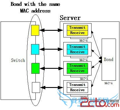 在802.3ab的支持下,Server端所有网卡的MAC地址全部配置成一个,例如MAC-A,然后在交换机端将这些端口聚合起来。交换机在接收到数据报文之后会轮询这些端口将数据报文发送给Bond驱动,Bond驱动想发送数据的时候同样通过轮询方法将数据报文交给不同网卡进行传输。这种方法可以对Client端进行透明,从整体架构上来说比较简单,唯一缺点是需要交换机的支持。个人认为对于存储系统而言,这种方案是目前网卡绑定的最佳方式。