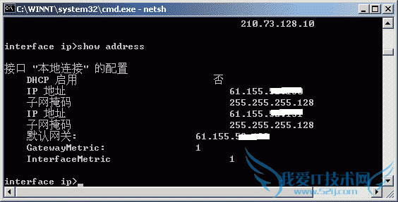 下面再在“Interface ip>”提示符下,输入形如“set address name static [addr] [mask] [gateway] [gwmetric]”格式的字符串命令,就可以为指定网卡设置IP地址、网络掩码地址或网关地址了。该命令中的“set address”字符,其实就是IP地址的设置命令,其中“name”字符串是用来指定当前系统的网络接口名称,在Windows 2000操作系统中,“name”字符串应该为“本地连接”,Windows XP系统、Windows 2003系统中“name”字符串应改为“Internet连接”;