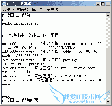 为了避免计算机系统突然发生故障,导致网络参数丢失,你可以在系统正常上网时,将网络参数保存成文本文件,以便重新安装系统时,能快速恢复。在保存当前的网络配置参数时,你可以先在开始菜单中,执行“运行”命令,打开运行对话框,在其中输入“cmd”字符串命令,单击“确定”按钮后,将屏幕界面切换到MS-DOS状态;在DOS命令行中,输入字符串命令“Netsh -c interface dump>c:config.txt”(注意,该命令中的“>”符号是用于重定向文件的),单击一下回车键后,当前的网络配置参数就会自动保存到C盘中的一个名为config.txt的文本文件中了,当然你也可以指定其他的保存位置。打开资源管理器界面,找到C盘中的config.txt文本文件,然后再用鼠标双击它,就可以浏览到当前的具体网络参数了,如图1所示。在这里,你将查看到当前工作站的静态IP地址、掩码地址、WINS服务器地址、DNS服务器地址等配置信息。