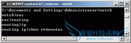 一般来说,要想查看本地网络中的路由表信息时,需要先登录到路由器中,然后通过相关查看命令,才能访问到本地的路由表信息。不过,利用网络命令Netsh,你可以非常方便地查看到本地网络中的路由表信息。在查看路由表中的路由信息时,可以先在DOS命令行中执行“Netsh”命令,然后在“Netsh>”提示符下执行“ras”命令,接着再依次执行“Routing”命令、“IP”命令,将屏幕切换到“Routing IP>”提示符状态下,接下来执行“show rtmroutes”命令(如图4所示),系统就能将本地路由表中的路由信息显示出来了,不过如果本地工作站没有启动“路由和远程服务”时,你将无法查看到路由表中的信息。