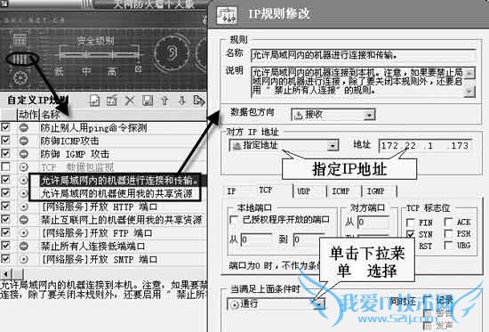 果冻提示 我们也可以只允许局域网内的某台电脑访问自己的共享资料,以达到保密的目的。在防火墙主面板上点击“IP规则管理”按钮,在弹出的IP规则列表中找到和局域网访问相关的规则并双击它,进入“IP规则修改”对话框,按照图2所示进行设置即可。