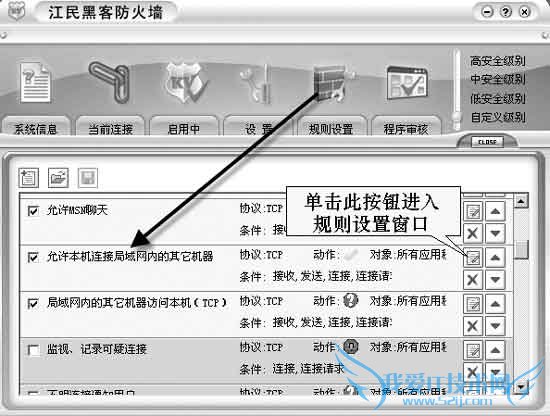 在这款防火墙的主界面上点击“IP规则设置”按钮,弹出IP规则列表。在这个IP规则列表中,可找到和局域网有关的两条IP规则:“允许本机连接局域网内的其它机器”、“局域网内的其它机器访问本机(TCP)”(图3)。