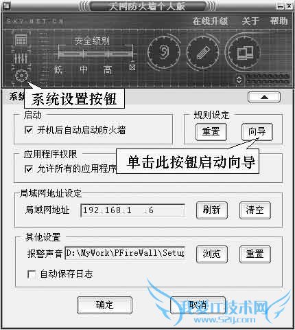 如果要解决这种因为初始设置不正确而导致的网络故障,我们可以重新调出向导进行设置。在天网防火墙的主面板上点击“系统设置”按钮,在弹出的“系统设置”窗口中,点击“规则设定”中的“向导”(图1),就会弹出设置向导。