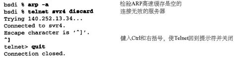 为了看清楚A R P的运作过程,我们执行t e l n e t命令与无效的服务器连接。