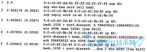 在每一行中,行号后面的数字表示t c p d u m p收到分组的时间(以秒为单位)。除第1行外,其他每行在括号中还包含了与上一行的时间差异(以秒为单位)。从这个图可以看出,发送A R P请求与收到A R P回答之间的延时是2.2 ms。而在0.7 ms之后发出第一段T C P报文。在本例中,用A R P进行动态地址解析的时间小于3 ms 。
