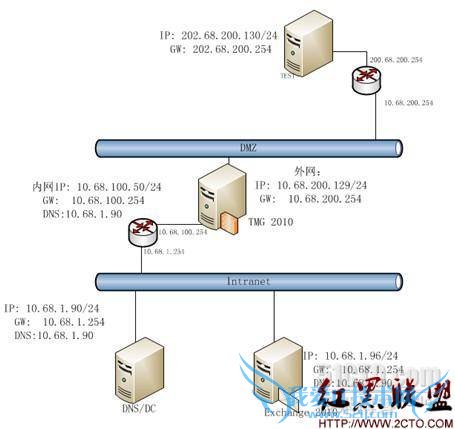 然后,进行测试,一切OK。正准备凯旋返回,甲方突然要求说,TMG的内网不能使用10.68.1.0网段,以后这个这网有特殊用途,推荐使用10.68.100.0网段。这样一来,拓扑图就发生了变化,如下图所示: