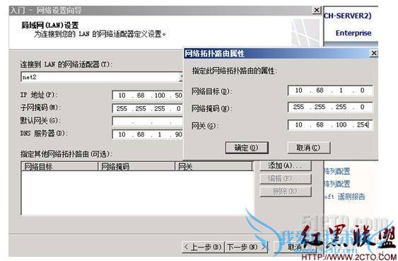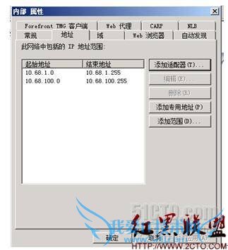 TMG的内网网卡为10.68.100.50,但内网中还包括其他网络,调整后的内网地址如下图所示:注意,多余的网段一定要去除,否则会生成不必要的路由项。