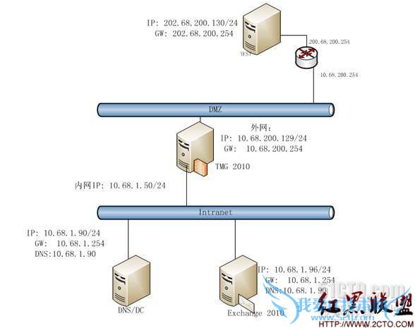其实本项目很简单,只是把内网中的Exchange Server 2010发布出来,供外网用户访问即可,一般的拓扑图很简单,如下图所示: