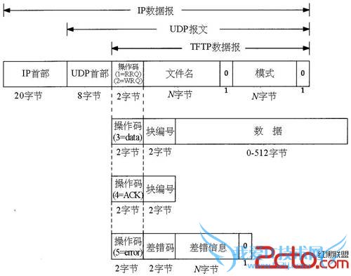 在开始工作时,TFTP的客户与服务器交换信息,客户发送一个读请求或写请求给服务器。在一个无盘系统进行系统引导的正常情况下,第一个请求是读请求(RRQ)。下图显示了5种TFTP报文格式(操作码为1和2的报文使用相同的格式)。