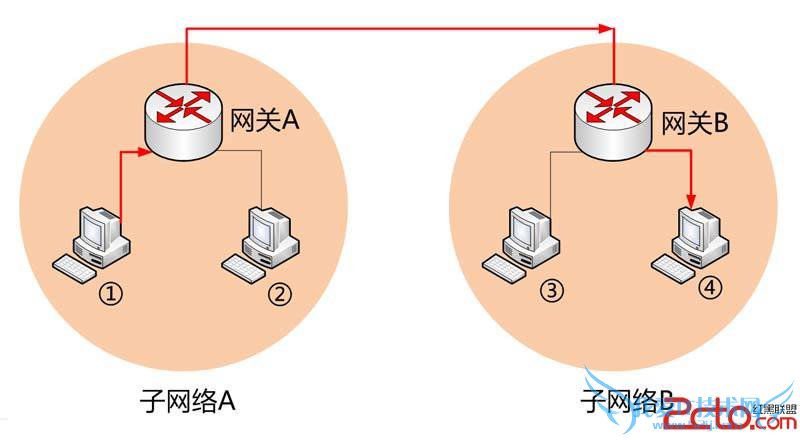 上图中,1 号电脑要向 4 号电脑发送一个数据包。它先判断 4 号电脑是否在同一个子网络,结果发现不是(后文介绍判断方法),于是就把这个数据包发到网关A。网关A通过路由协议,发现 4 号电脑位于子网络B,又把数据包发给网关B,网关B再转发到 4 号电脑。