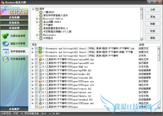 选择好要分析的软件后,鼠标单击“分析”按钮,Windows优化大师就开始智能分析与该软件相关的信息了。