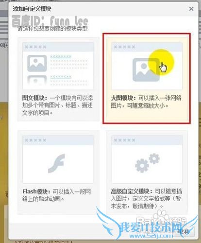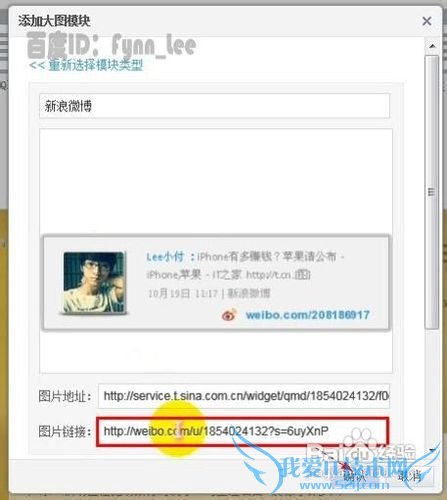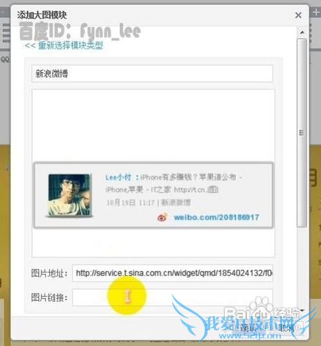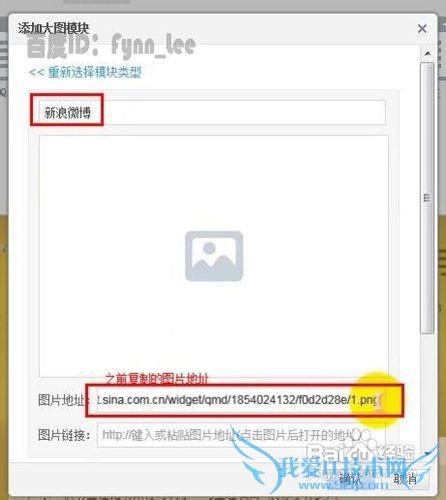 在弹出的“添加自定义模块”窗口内新建大图模块,开启咱们的微博签名档之旅。然后在顶部的文本框中输入模块标题,用户可以设置为“新浪微博”或者其他神马自己喜欢的名称,名称一切都是浮云。之后,将之前在新浪微博页面复制的图片地址粘贴到此窗口下方“图片地址”标签后的文本框中。