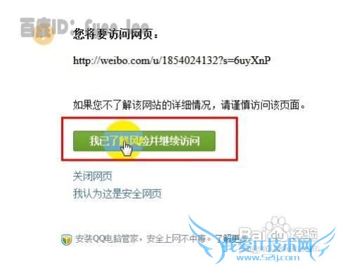 添加签名档后,点击页面顶部的“保存”按钮,然后点击自己的微博签名档便链接到了微博主页,为了安全起见,QQ空间可能不会直接将此链接转到指定地址,需要点击“我已了解风险并继续访问”按钮即可。