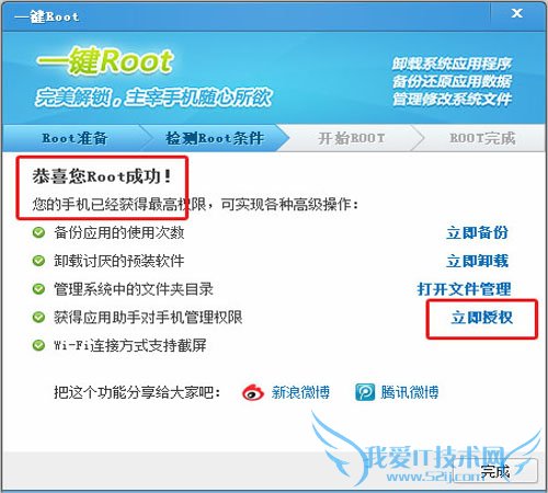 当出现“恭喜您Root成功”的字样时,就说明您手机已经成功的通过腾讯手机管家(PC版) for Android获取了Root的权限。这时候,您还需要点击“立即授权”把手机的Root权限授权给腾讯手机管家(PC版)。