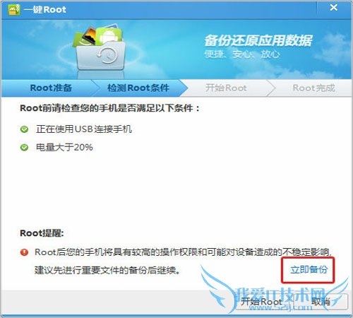 其次,还需要检测Root的两个必备条件:使用USB连接手机和电量大于20%,在这里还会温馨提示您进行资源的备份,防止任何意外的发生;