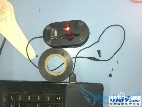 8、最后将修好的鼠标插进电脑试了试,鼠标的底部扫描灯亮了起来,证明鼠标修好了。