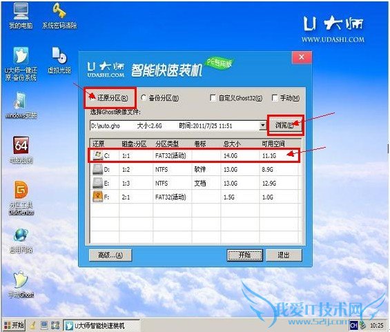 进入winpe系统后,运行U大师一键还原备份软件,开始恢复操作系统!选择你要恢复的系统文件,选择系统安装磁盘,选择完后点击确定,如下图