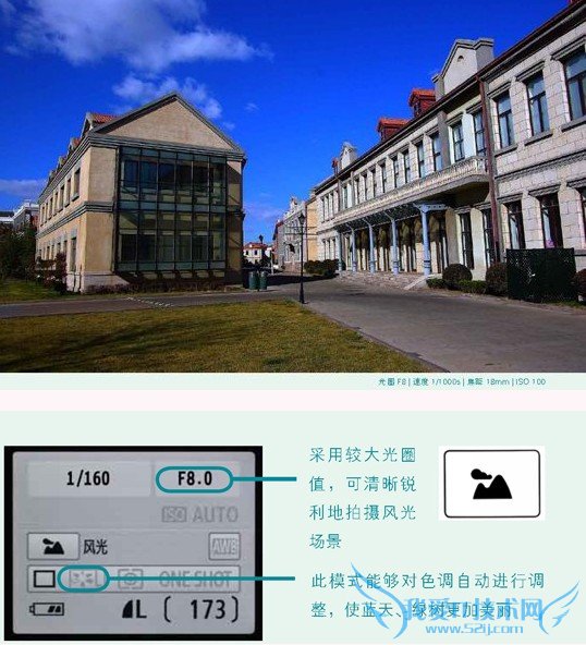 风光模式适合拍摄辽阔的风光、夜景等题材。风光模式下的相机设置,光圈数值较大,数码单反相机将根据情况设定小光圈以求达到大景深的目的。如果摄影者使用变焦镜头进行拍摄,那么使用镜头的广角端可以使近处和远处的主体都能合焦,其效果优于长焦端。在画质方面,风光拍摄模式能够提高画面锐利度,对画面细节部分进行细致表现,并加强绿色、红色、蓝色等色彩的色调,使天空和树木等物体的色彩更加鲜艳。另外,虽然采用的是比较大的光圈值,但由于ISO感光度被设置为自动,相机会自动对感光度进行调整,所以通常能够以合适的快门速度进行拍摄。