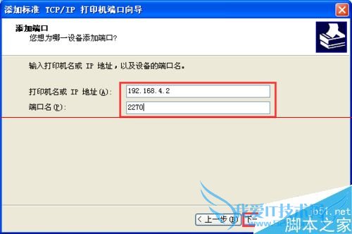 4、输入在新打印机上设定的IP地址,并重命名该IP地址的名称后,点击 下一步: