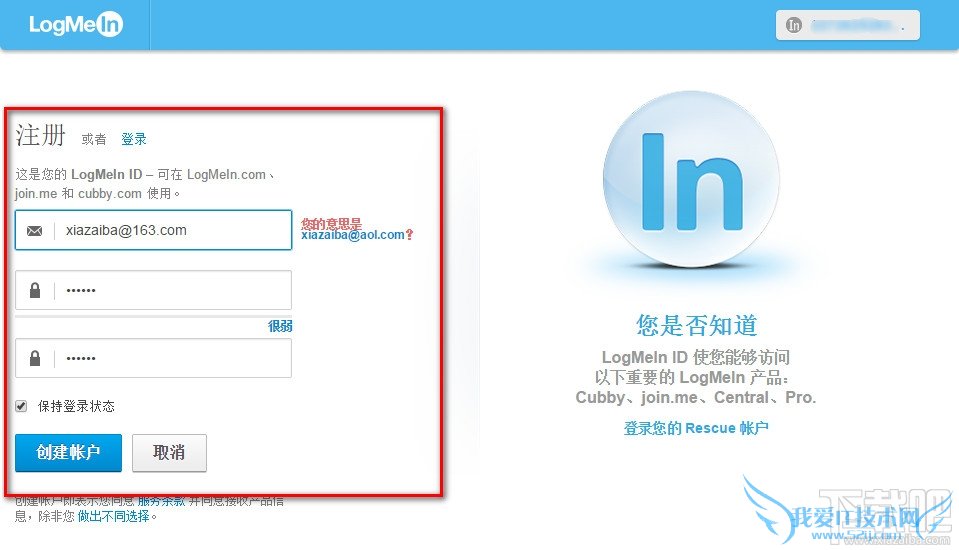 2:小编给大家提供的注册网址:注册LogMeln地址。填写上方的资料后,点击创建帐号。你填写的邮箱就会收到邮件。