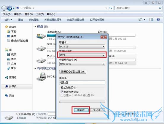 当用户将这个U盘中的文件全部备份之后,接下来用户就可以对这个盘符的系统进行更新的操作。同样也是在这个盘符的图标上,单击鼠标右健,在出现的列表中找到‘格式化’,单击鼠标选择这一项,这个时候系统会出现一个格式化的页面,用户此时只需要将中间一个选项‘文件系统’进行更改。用鼠标单击下拉选项,在这个里面找到NTFS之后选中。然后再用鼠标单击页面最下方的‘开始’。