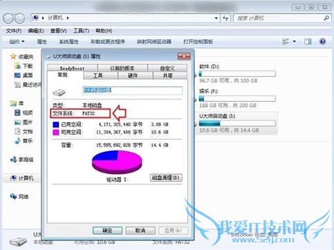 想要解决此类问题,首先,用户需要核实一下这个盘符的格式情况,看是否是因为这方面的问题导致。此时可以将鼠标移至这个盘符的图标上面,单击鼠标右健后会出现一列菜单,在这个菜单中找到‘属性’,此时用户会看到,这个盘符是一个FAT32的格式,可以看出这样的盘符运行确实会比较慢,应该更新为最新的NTFS格式会更好用。