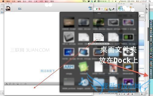但问题来了,由于工作原因,我经常需要往QQ里拖文件发给同事,当然有时候是往浏览器或者其他程序里拖。由于我的常用东西都在桌面上,且开着一大堆窗口,想从桌面上拖文件就麻烦了。虽然可以使用提供的“把文件拖到dock图标不松手等2秒!”的方法,但我觉得这个效率实在是低,要是有好几个qq窗口就得至少等4秒,拖和放再加两秒就是6秒,我抽袋烟都够了。终于,我找到了一个更好的解决方案, 那就是把桌面文件夹入口放到Dock栏(方便访问桌面内容),要拖文件的时候直接在Dock栏里点开桌面往窗口里拖就是了,看图: