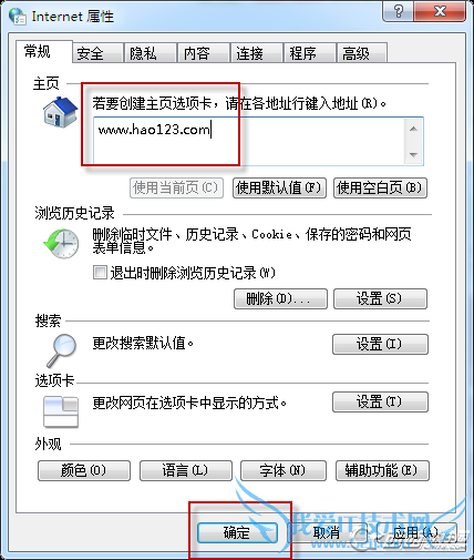 3、更改主页,确定后重新打开浏览器就是hao123为主页了。